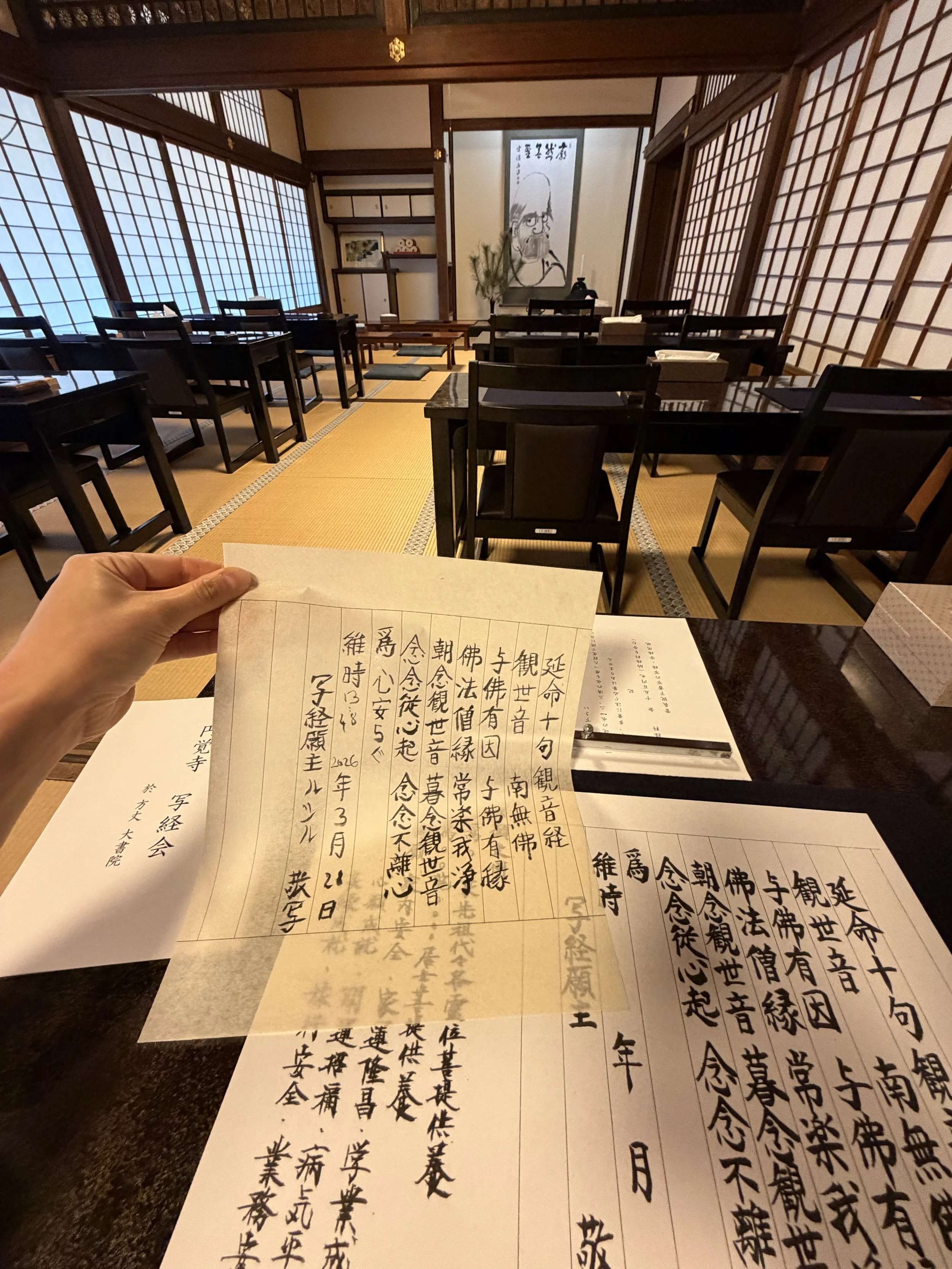 I ended up in a small room inside the temple, transcribing sutras. I was completely alone, copying characters I didn’t understand, trying to be precise, slow, present. Then I joined a zazen session — entirely in Japanese. I didn’t understand much, but I learned the posture: legs crossed, hands together, thumbs touching. Bare feet on soft tatami. Stillness.